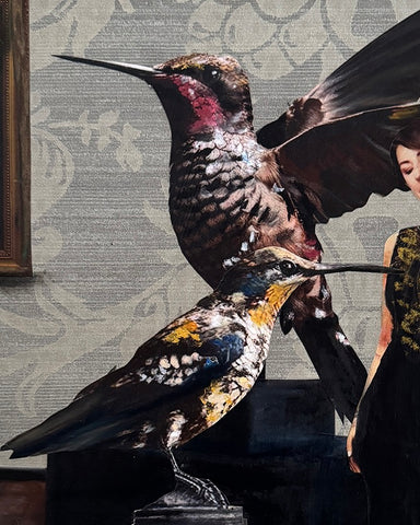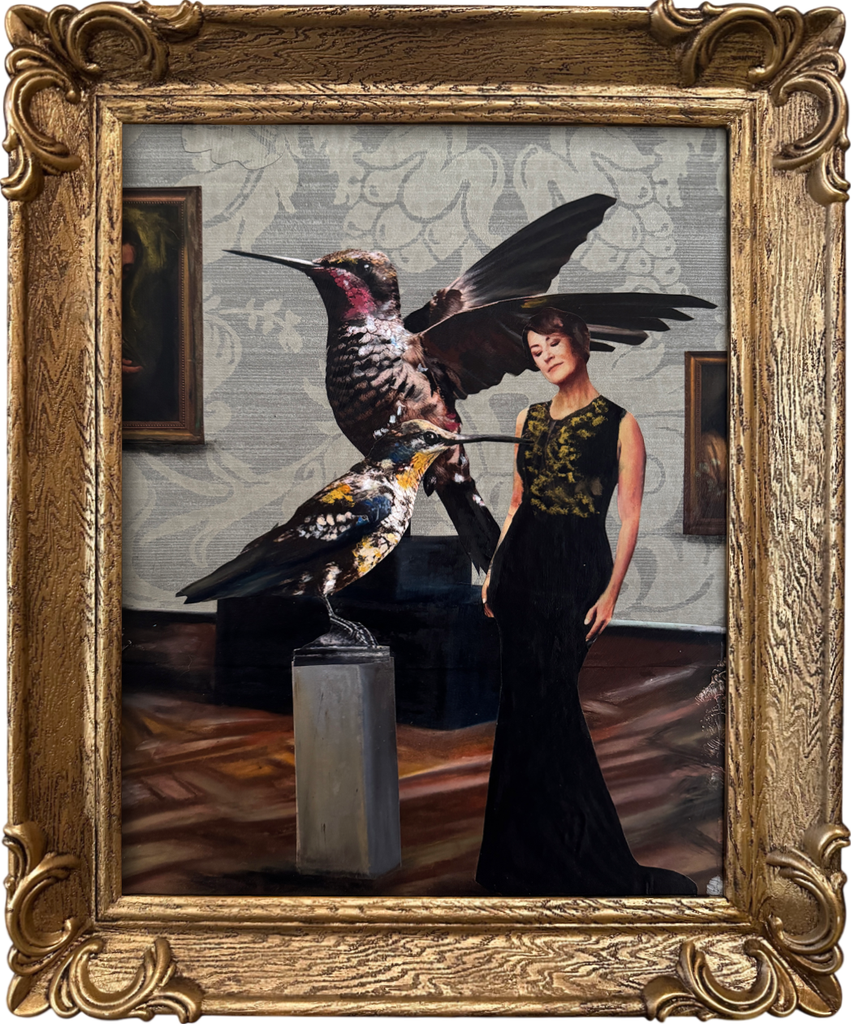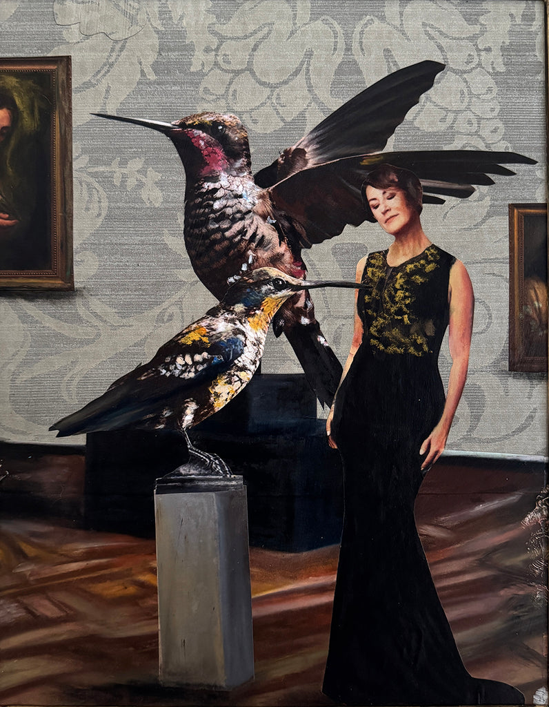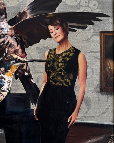 Mixed media collage on wood panel